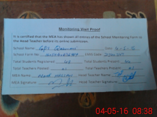 | Attendance Register | Head Teacher | MEA with School | Visit Proof |