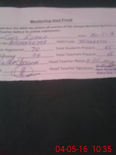 | Attendance Register | Head Teacher | MEA with School | Visit Proof |