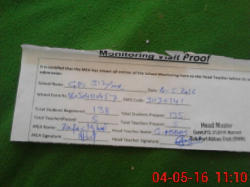 | Attendance Register | Head Teacher | MEA with School | Visit Proof |