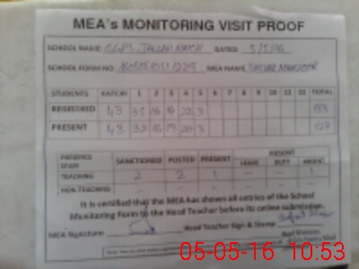 | Attendance Register | Head Teacher | MEA with School | Visit Proof |