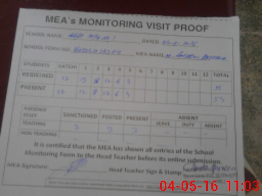 | Attendance Register | Head Teacher | MEA with School | Visit Proof |
