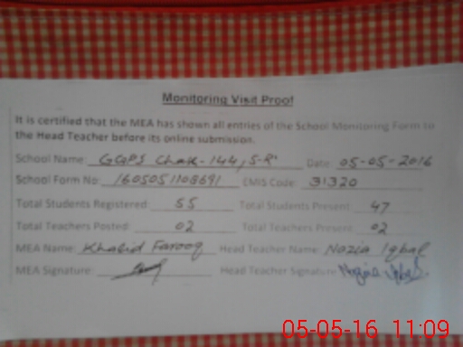 | EMIS Code: 31320535 | Name of School: GGPS CHAK NO 144/A | |||