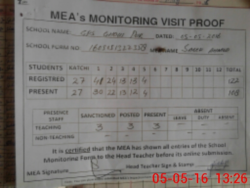 | Attendance Register | Head Teacher | MEA with School | Visit Proof |
