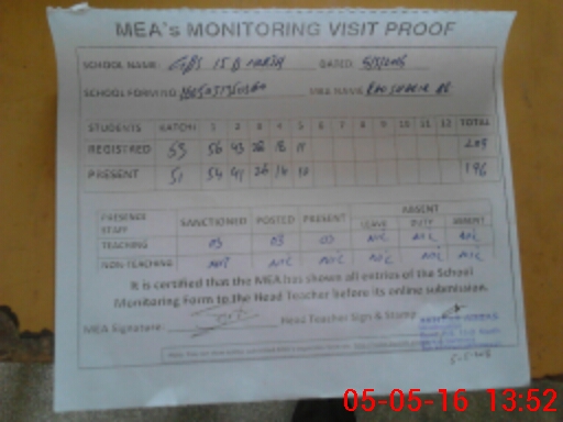 | Attendance Register | Head Teacher | MEA with School | Visit Proof |