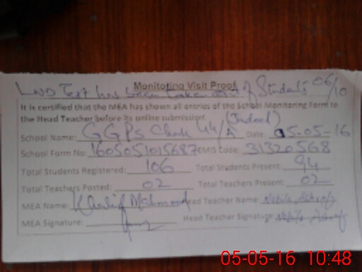 | EMIS Code: 31320568 | Name of School: GGPS CHAK 44/A JADEED | |||