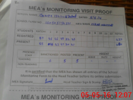 | Attendance Register | Head Teacher | MEA with School | Visit Proof |