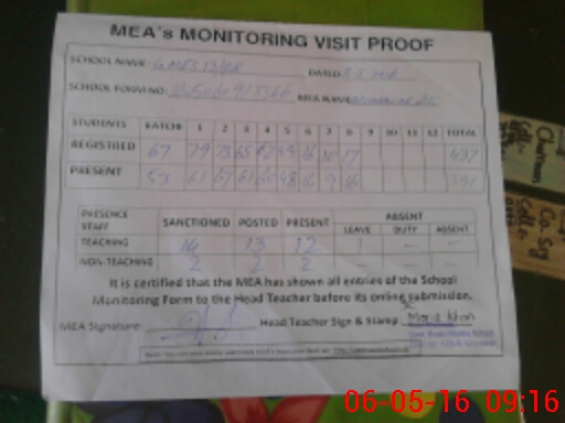 | Attendance Register | Head Teacher | MEA with School | Visit Proof |