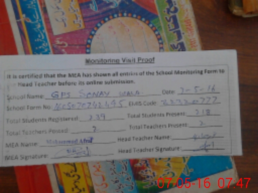 | Attendance Register | Head Teacher | MEA with School | Visit Proof |