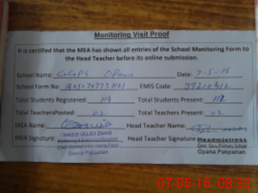 | Certified that this School was Inspected by the Undersigned MEA/DMO Today and the Information Stated Above is as Per Record. | |||||