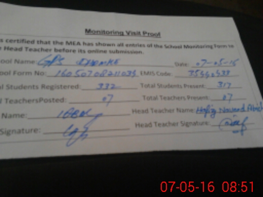 | Attendance Register | Head Teacher | MEA with School | Visit Proof |