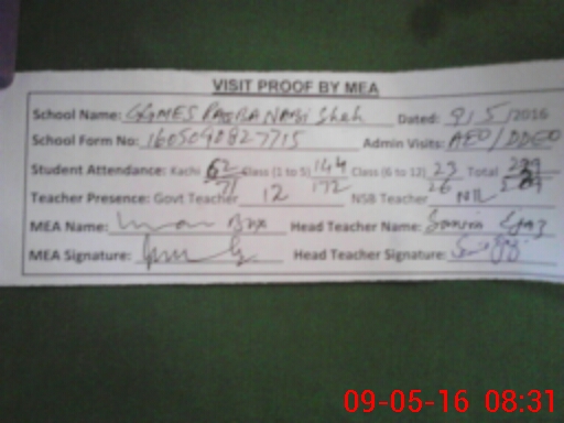 | School Visited by School Health & Nutrition Supervisor (No. of Visits) | 1 | Name1: | Sara Safdar | Name2: | Nil |