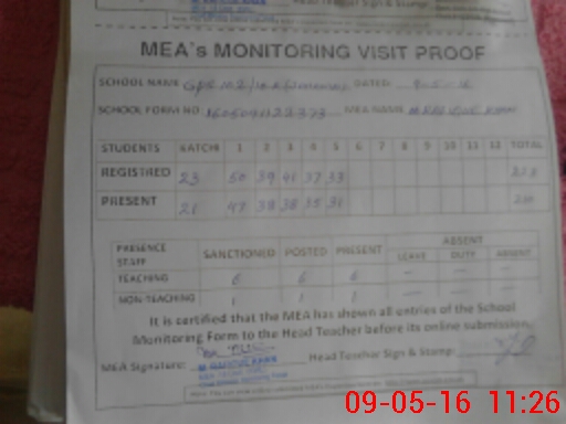 | Attendance Register | Head Teacher | MEA with School | Visit Proof |