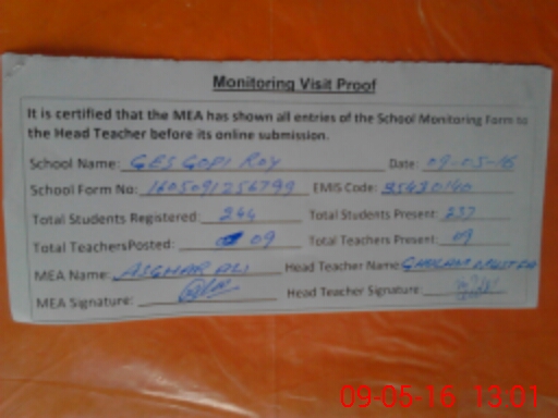 | Attendance Register | Head Teacher | MEA with School | Visit Proof |