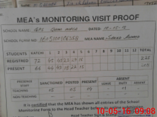 | Attendance Register | Head Teacher | MEA with School | Visit Proof |