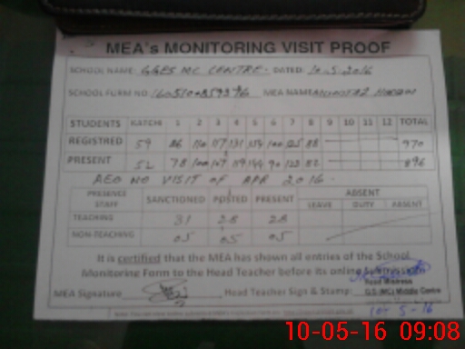 | Attendance Register | Head Teacher | MEA with School | Visit Proof |