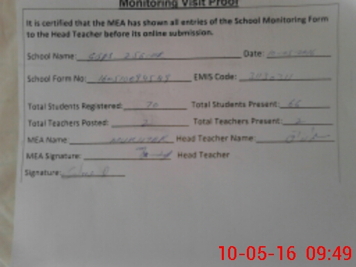 | Attendance Register | Head Teacher | MEA with School | Visit Proof |