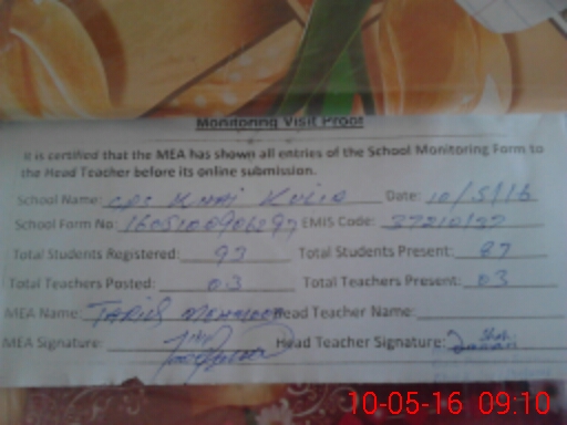 | Attendance Register | Head Teacher | MEA with School | Visit Proof |