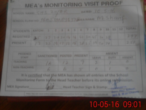 | Attendance Register | Head Teacher | MEA with School | Visit Proof |