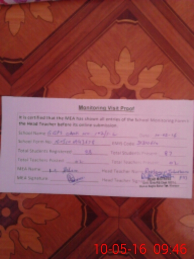 | Monitoring Date: 10-05-2016 | Start Time: 10-05-2016 09:12 AM | End Time: 10-05-2016 09:47 AM | Name of MEA: Mu**** As**** -KP**** | |