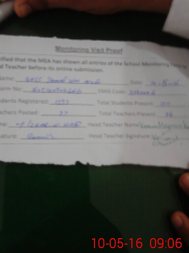 | Monitoring Date: 10-05-2016 | Start Time: 10-05-2016 08:28 AM | End Time: 10-05-2016 09:10 AM | Name of MEA: Mu**** Iz**** UlHa**** | |