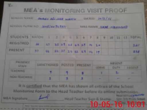 | Certified that this School was Inspected by the Undersigned MEA/DMO Today and the Information Stated Above is as Per Record. | |||||