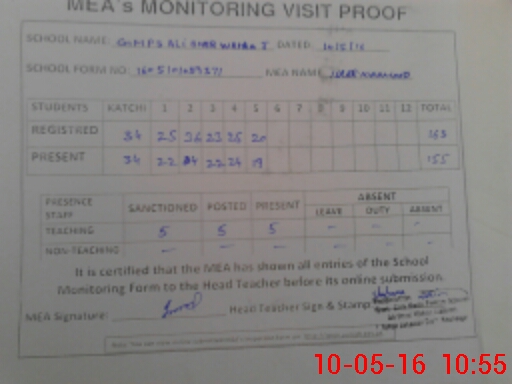 | Attendance Register | Head Teacher | MEA with School | Visit Proof |