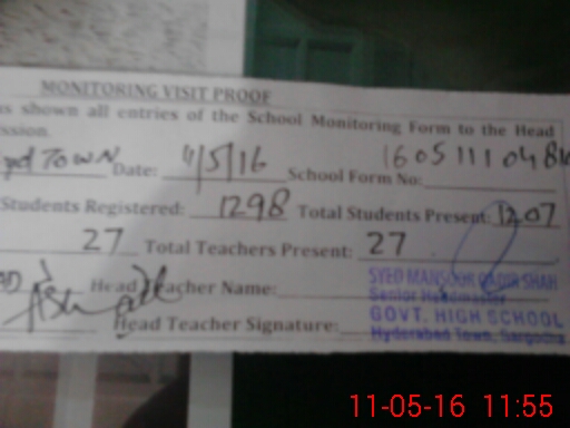 | Total no. of Classrooms: 19 No. of Classrooms Used for Teaching: 15 No. of Classrooms Storing Old Furniture, FTBs, etc: 4Comments if Any: EST Abid Hussain DM MUHAMMAD Zahoor SST MUHAMMAD Basit name not on tab 2 office 1 sci lab 1 staff room |