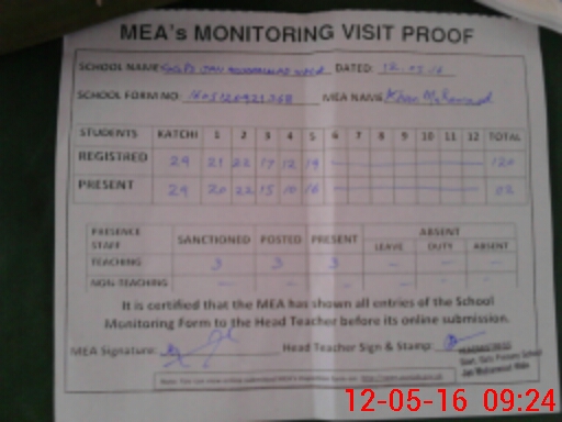 | Attendance Register | Head Teacher | MEA with School | Visit Proof |