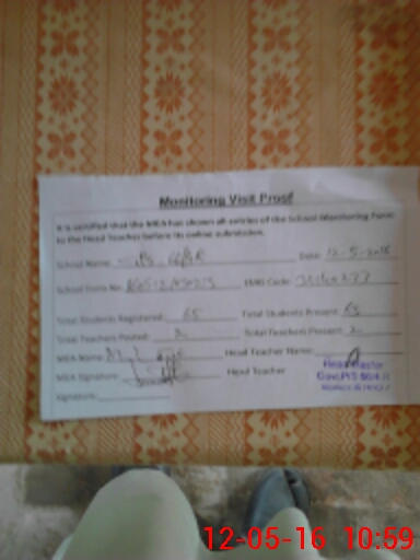 | Remarks (Use Separate Page if Required): HEAD TEACHER STATED THAT DTE NAMED ABDUL RASHEED IS GETTING RUPEES 130 PER MONTH FOR PAPERS WITH OUT GIVING BILL SINCE LONG 02 CLASS ROOMS UNDER CONSTRUCTION | |||||