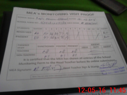 | Attendance Register | Head Teacher | MEA with School | Visit Proof |